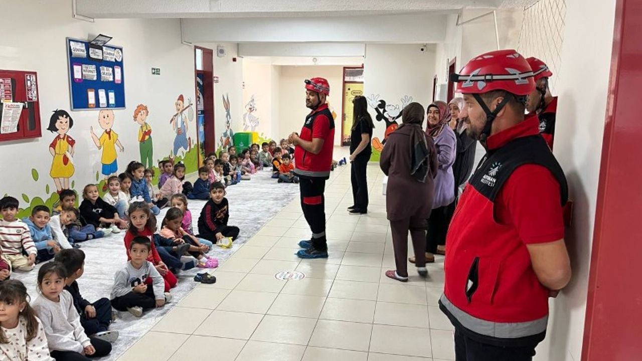 Bahçecik ve Sümer Anaokullarında gerçekleştirilen etkinliklerde minik öğrencilere, olası bir deprem anında nasıl davranmaları gerektiği anlatıldı.