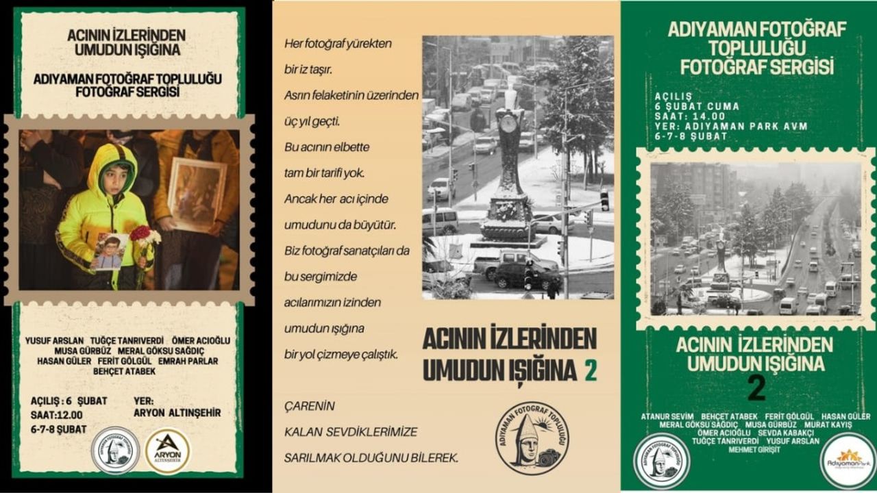 Adıyaman Park AVM'de gerçekleşecek sergide ise aynı başlığın devam serisi olarak 'Acının İzlerinden Umudun Işığına 2' temasıyla farklı fotoğrafların yer alacağı bildirildi. Sergideki karelerin ziyaretçilere samimi anlar yaşatacağı, doğanın ve hayatın içindeki dayanıklılığa dair farkındalık oluşturacağı ifade edildi.