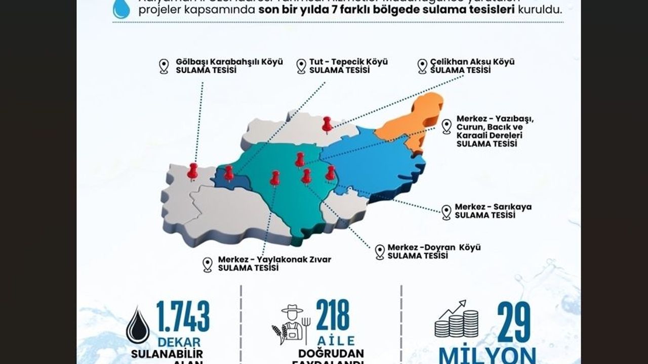 Bu kapsamda, Gölbaşı Karabahşili Köyü Sulama Tesisi , Tut Tepecik Köyü Sulama Tesisi, Çelikhan Aksu Köyü Sulama Tesisi, Merkez Yaylakonak Sulama Tesisi Merkez Doyran Köyü Sulama Tesisi, Merkez Sarıkaya Köyü Sulama Tesisi, Merkez Yazıbaşı Köyü Sulama Tesisleri 2025 yılı içerisinde tamamlanarak hizmete sunulmuş olup bu projelerin tamamlanmasıyla vatandaşların bir çok alanda kolaylık yaşaması sağlanmıştır.