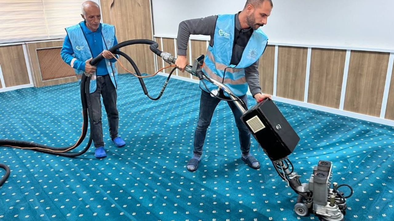 Belediye personeli, sabahın erken saatlerinden itibaren cami ve mescitlerde kapsamlı temizlik yaparak halılar başta olmak üzere tüm alanları detaylı şekilde temizliyor.