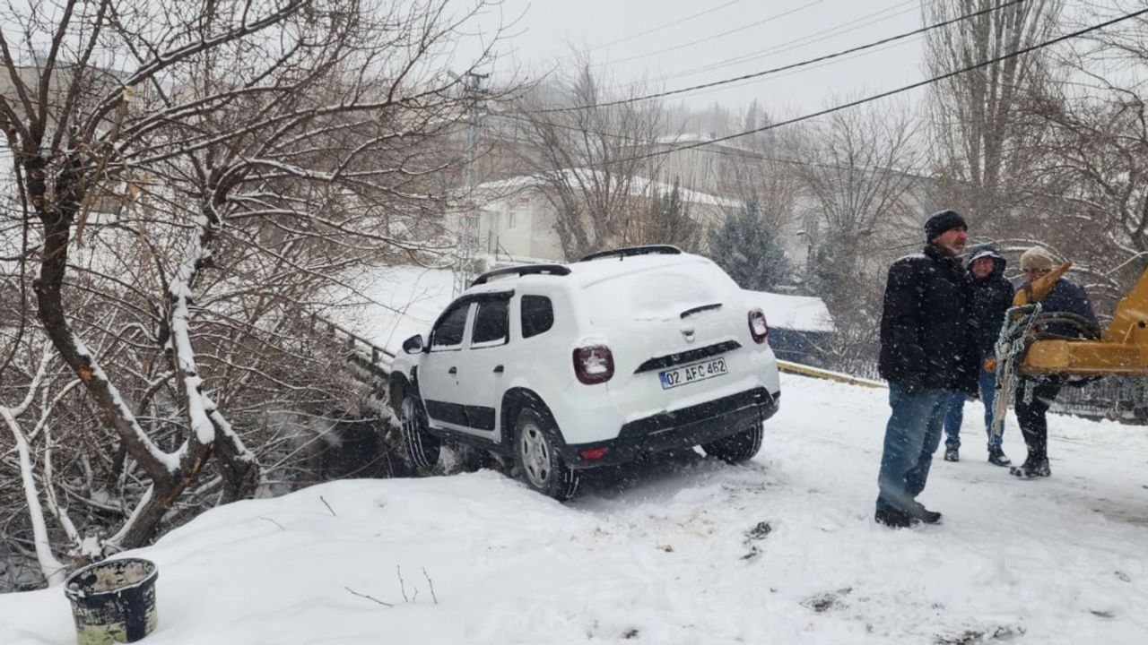 ADIYAMAN (PERRE) - Adıyaman'da etkisini artıran kar yağışı, sürücülere zor anlar yaşattı. Merkeze bağlı İndere (Zey) Köyü'nde, 02 AFC 462 plakalı araç, kayganlaşan yolda kontrolden çıkarak köprüden uçma tehlikesi geçirdi. Aracın ön kısmı köprüde askıda kaldı.