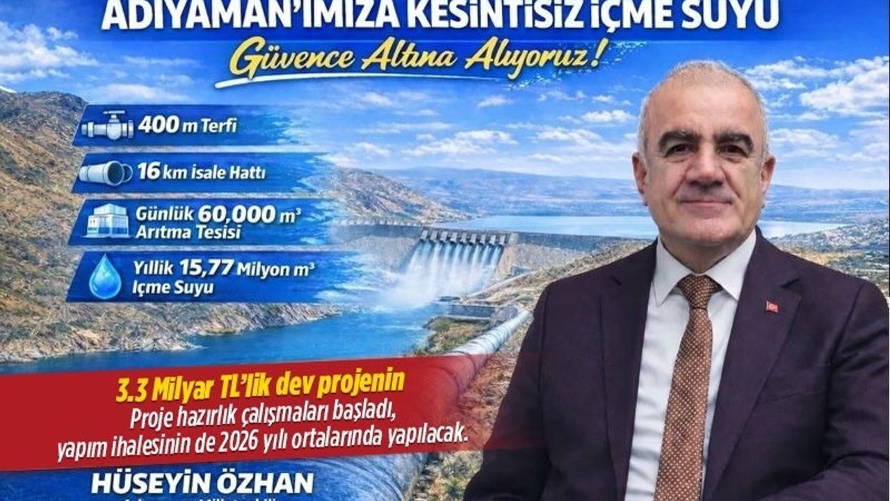 Müjdeyi kamuoyuyla paylaşan AK Parti Adıyaman Milletvekili Hüseyin Özhan, projenin kentin uzun vadeli içme suyu ihtiyacını karşılayacağını vurgulayarak, hazırlık çalışmalarının tamamlanmasının ardından 2026 yılı ortalarında yapım ihalesine çıkılarak inşaat sürecinin başlatılmasının planlandığını açıkladı.