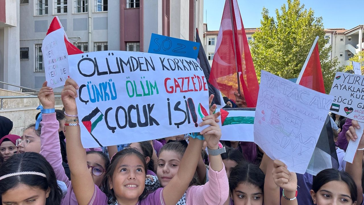 Kahta TP Lisesi ve Ortaokulu öğrencileri, okul bahçesinde ellerinde Filistin bayraklarıyla toplanarak 'Gazze'nin Yanındayız' yazılı pankartlar taşıdı.