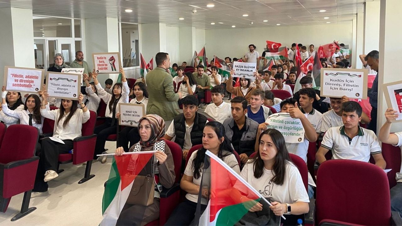 Okulun konferans salonunda gerçekleştirilen programda öğrenciler, Filistin temalı şarkılar seslendirdi ve hazırladıkları afişlerle yaşanan insani drama dikkat çekti. 'Kudüs için özgürlük, Filistin için barış', 'Gazze ölüyor ey insanlık' ve 'Kudüs özgür değilse dünya esirdir' yazılı dövizler, etkinliğe katılanların duyarlılığını yansıttı.
