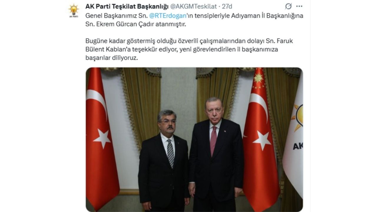 'Genel Başkanımız Sn. @RTErdogan'ın tensipleriyle Adıyaman İl Başkanlığına Sn. Ekrem Gürcan Çadır atanmıştır. Bugüne kadar göstermiş olduğu özverili çalışmalarından dolayı Sn. Faruk Bülent Kablan'a teşekkür ediyor, yeni görevlendirilen il başkanımıza başarılar diliyoruz.'