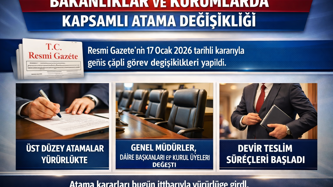 Resmi Gazete’nin 17 Ocak 2026 tarihli sayısında yayımlanan Cumhurbaşkanlığı atama kararları kamuoyuna duyuruldu. Kararlara göre çeşitli kurum ve kuruluşlarda görev değişiklikleri ile yeni atamalar gerçekleştirildi. Atama kararları bölüm bölüm şu şekildedir: