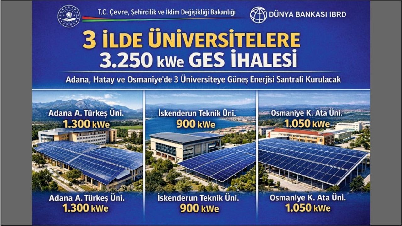 Çevre, Şehircilik ve İklim Değişikliği Bakanlığı, Uluslararası İmar ve Kalkınma Bankası (IBRD) kredisiyle finanse edilen “Kamu ve Belediye Yenilenebilir Enerji” (KAYEP) projesi kapsamında, Adana, Hatay ve Osmaniye illerindeki üç üniversitede güneş enerjisi santrali (GES) kurulumu için ihale açtı.
