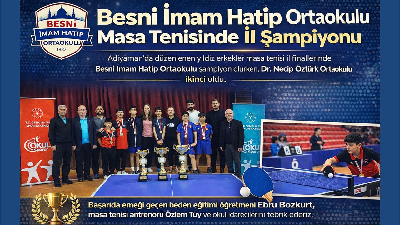 Adıyaman Gençlik ve Spor İl Müdürlüğü Tunahan Özbilgin Gençlik Merkezi Spor Salonu’nda yapılan müsabakalarda il genelinden toplam 30 okul mücadele etti. Turnuva sonunda Besni İmam Hatip Ortaokulu Adıyaman şampiyonu olurken, bir diğer Besni temsilcisi Dr. Necip Öztürk Ortaokulu ise il ikinciliğini elde etti.