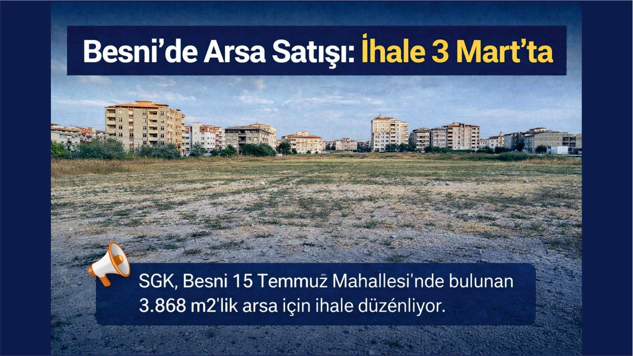 Sosyal Güvenlik Kurumu Başkanlığına ait, **Besni ilçesi 15 Temmuz Şehitler Mahallesi sınırlarında yer alan taşınmazın satışı yapılacak.
