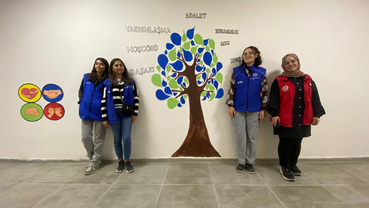 Gençlik Merkezi gönüllüleri, özellikle okulun anasınıfı bölümü ve giriş alanına odaklandı. Bu alanlara, çocukların hayal dünyalarını zenginleştirecek, sevgi, dayanışma ve yardımlaşma gibi evrensel değerleri vurgulayan renkli resimler çizildi. Yapılan çalışma, okulun sıradan duvarlarını birer sanat eserine dönüştürerek, öğrenciler için daha sıcak ve teşvik edici bir öğrenme ortamı yarattı.