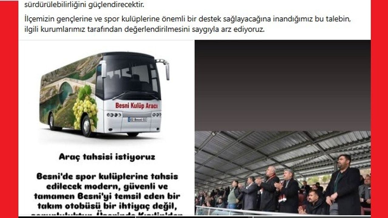Spor kulüplerinin ilçe sporuna olumlu katkısının altı çizilen bildiri şöyle; “Besni’mizde faaliyet gösteren futbol takımları ve spor kulüpleri, ilçemizi çeşitli müsabakalarda temsil ederek önemli bir görev üstlenmektedir. Ancak deplasmanlara gidiş gelişlerde yaşanan araç temini sorunu, kulüplerimizin faaliyetlerini aksatmakta ve sporcularımızın motivasyonunu olumsuz etkilemektedir. Bu kapsamda, Besni Belediyesi ve Besni Kaymakamlığı’ndan; spor kulüplerimizin ortak kullanımına sunulmak üzere, ilçemizin değerlerini yansıtan Besni temalı bir kulüp otobüsünün tahsis edilmesini talep ediyoruz. Üzerinde Kızılın, Besni üzümü ve kültürel öğelerimizin yer alacağı bu araç, aynı zamanda ilçemizin tanıtımına katkı sağlayacaktır. Söz konusu aracın sağlanması, sporcularımızın güvenli ve düzenli ulaşımını temin edecek, kulüplerimizin deplasman süreçlerini daha planlı hâle getirecek ve sportif faaliyetlerin sürdürülebilirliğini güçlendirecektir. İlçemizin gençlerine ve spor kulüplerine önemli bir destek sağlayacağına inandığımız bu talebin, ilgili kurumlarımız tarafından değerlendirilmesini saygıyla arz ediyoruz.”