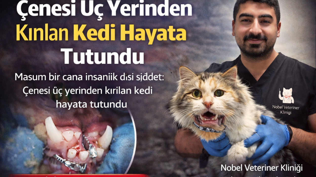 Durumu fark eden iş yeri sahibi, kediyi vakit kaybetmeden aynı zamanda hayvan gönüllüsü olan Nobel Veteriner Kliniği’ne götürdü. Yapılan röntgen ve sağlık kontrollerinde, kedinin çenesinin üç ayrı noktadan kırıldığı, sağ taraftaki kırık parçanın ise üst damağa saplandığı tespit edildi.