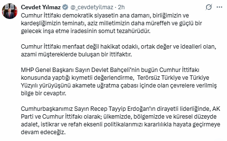 Cumhurbaşkanı Yardımcısı Cevdet Yılmaz, MHP Genel Başkanı Devlet Bahçeli'nin TBMM'deki grup toplantısındaki açıklamalarına ilişkin değerlendirme yaptı. Yılmaz, Bahçeli'nin sözlerinin 'Terörsüz Türkiye ve Türkiye Yüzyılı yürüyüşünü akamete uğratma çabası içinde olan çevrelere verilmiş bilge bir cevap' olduğunu ifade etti.