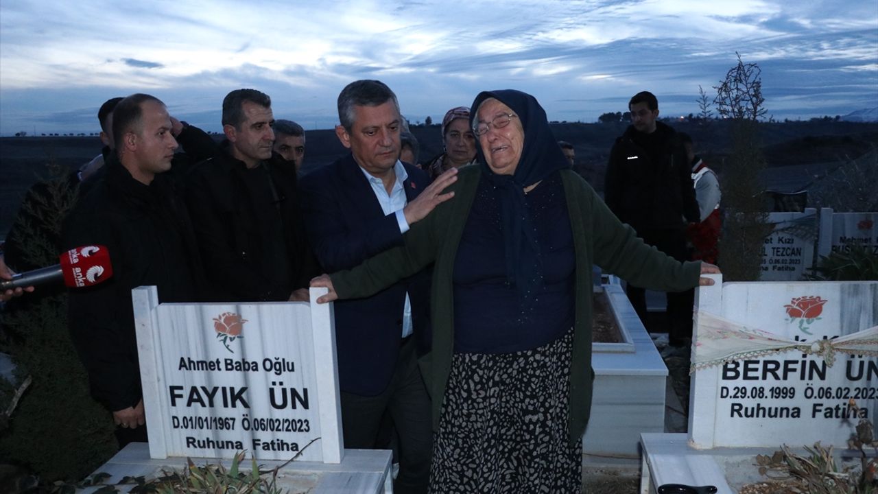 Depremlerde ölenlerin yakınlarına başsağlığı dileyen Özel, kabirlere karanfil bırakarak dua okudu.