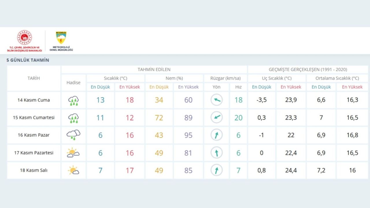 Meteoroloji Genel Müdürlüğü'nün 5 günlük hava tahmin raporuna göre, 15 Kasım Cumartesi günü Adıyaman'da yağmurlu hava etkili olacak.