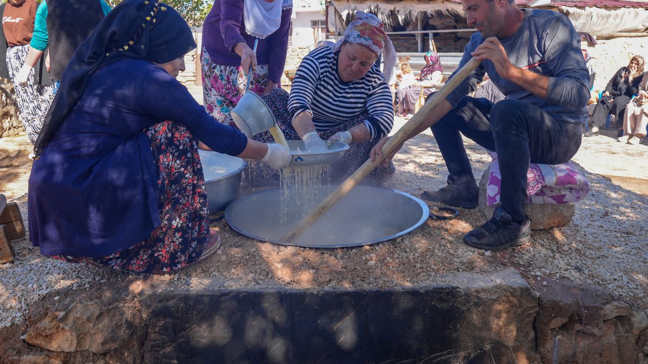 Konuşmaların ardından protokoldekiler kazan başına geçip, ipe takılı cevizleri kaynayan bulamaca batırdı.