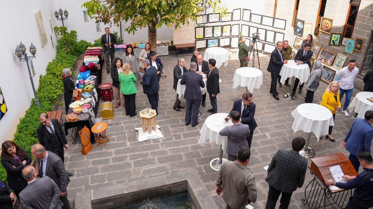 Merkez Sur ilçesi Ahmet Arif Edebiyat Müze Kütüphanesi'nde düzenlenen programda, kurum bünyesinde açılan resim, rölyef, konfeksiyon, ahşap ve takı tasarım gibi birçok kursta eğitim gören 13-18 yaş arası tutuklu ve hükümlülerin yaptığı sulu boya resim, kağıt rölyef, nevresim takımı, takı ve ahşap baskı ürünlerin yer aldığı serginin açılışı gerçekleştirildi.