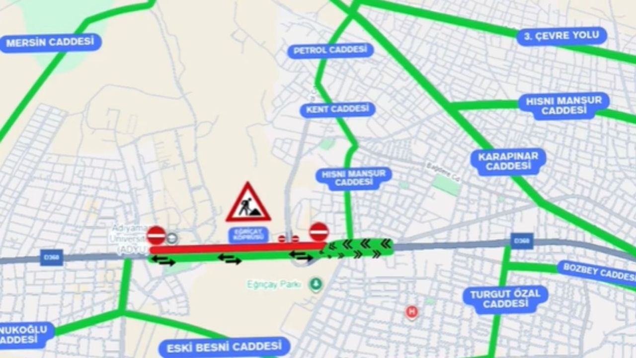 Adıyaman'da Karayolları Genel Müdürlüğü tarafından yürütülen Eğriçay Köprüsü yenileme çalışmaları bugün başladı. Çalışmalar kapsamında Atatürk Bulvarı üzerindeki köprüde trafik akışı geçici olarak tek şerit üzerinden gidiş-geliş şeklinde sağlanacak.