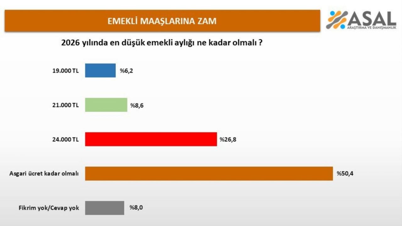ANKARA (PERRE) - (Emrah PARLAR) - 2026 yılında emekli maaşlarına yönelik beklentileri ortaya koyan kamuoyu araştırmasının sonuçları paylaşıldı. ASAL Araştırma ve Danışmanlık tarafından Aralık 2025'te gerçekleştirilen çalışmada, vatandaşlara '2026 yılında en düşük emekli aylığı ne kadar olmalı?' sorusu yöneltildi.