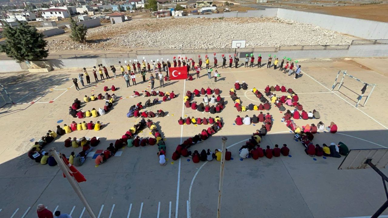 Gaziantep'in Nurdağı ilçesinde ortaokul öğrencileri, Filistin'e destek olmak için okul bahçesinde 'Özgür Gazze' yazılı koreografi oluşturdu.
