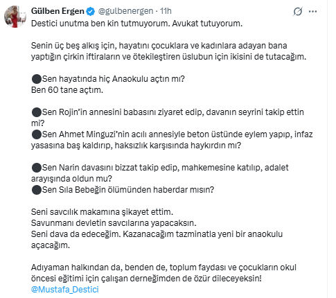 Bugüne kadar 60 anaokulu açtığını vurgulayan Ergen, çeşitli çocuk ve kadın davalarını yakından takip ettiğini belirterek, Destici'ye yönelik eleştirilerini sürdürdü. Ergen, 'Seni savcılık makamına şikâyet ettim. Savunmanı devletin savcılarına yapacaksın. Seni dava da edeceğim. Kazanacağım tazminatla yeni bir anaokulu açacağım' dedi.