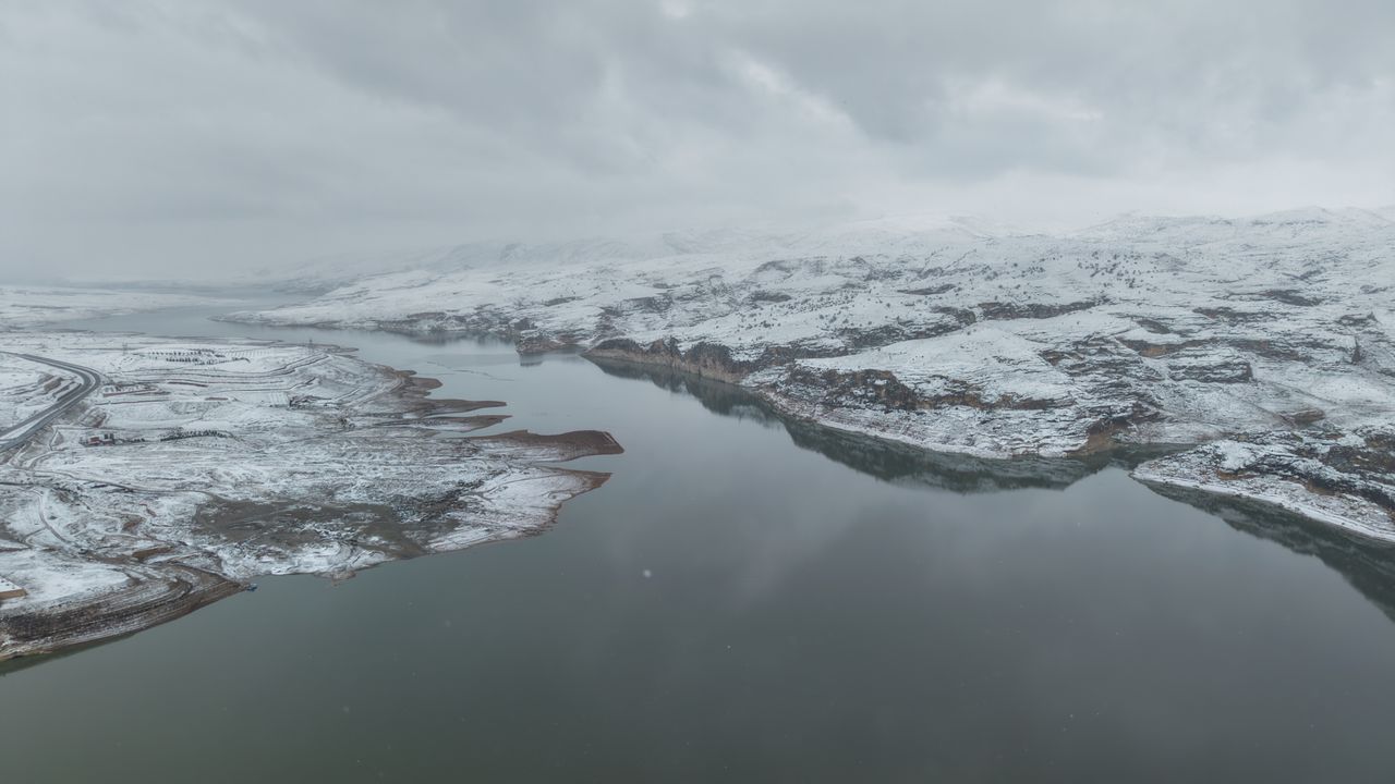 Baraj gölü ve karla kaplı çevresi dronla görüntülendi.