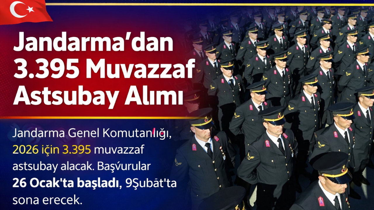 Jandarma Genel Komutanlığı, 2026 yılı için muvazzaf astsubay alımı başvurularını açıkladı. Toplam 3 bin 395 kontenjan için başvurular 26 Ocak 2026 tarihinde başlayacak ve 9 Şubat 2026’da sona erecek.