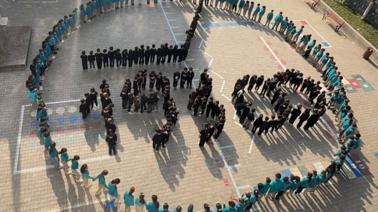 Hasan Sünnüoğlu İlkokulu öğrencileri okul bahçesinde el ele vererek yuvarlak saat figürü oluşturdu.