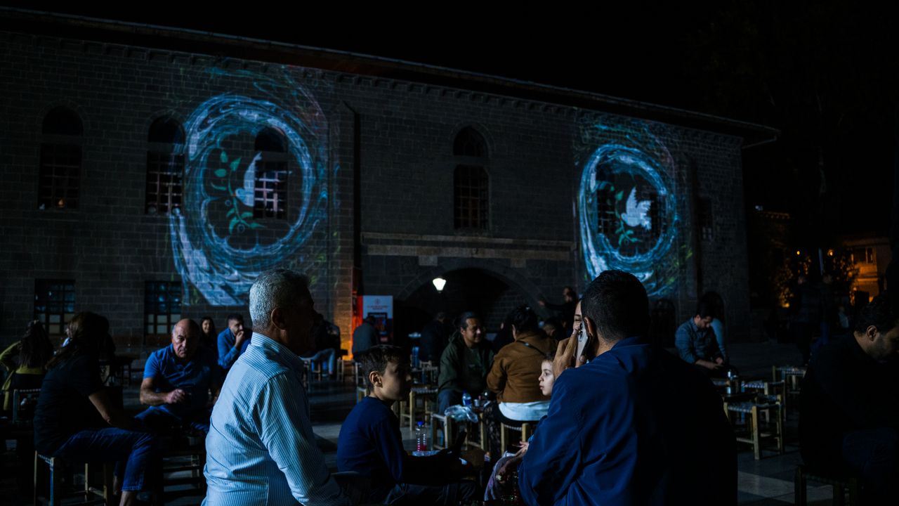 Sanatçı Abdulvahap Ertekin'in eserlerinden oluşan, İsmail Erdoğan küratörlüğünü üstlendiği 'Nehirden Denize Özgür Filistin' canlı ebru mapping gösterisi Ulu Cami'de izleyicilere görsel bir şölen sundu.
