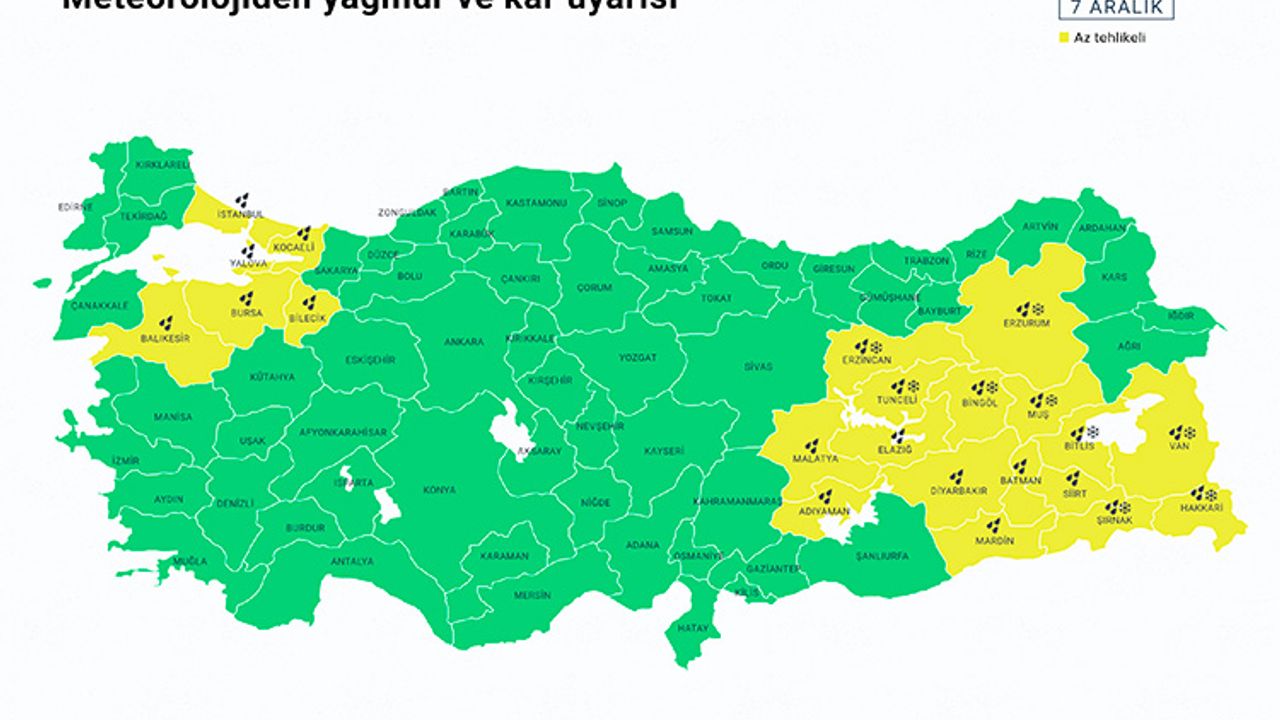Yapılan son değerlendirmelere göre Malatya, Elazığ, Tunceli, Bingöl, Bitlis, Muş ve Şırnak çevreleri ile Erzincan ve Erzurum’un güney kesimlerinde yağışların kuvvetli olması bekleniyor. Özellikle Tunceli, Bingöl, Muş çevreleri ile Şırnak’ın doğusunda, Erzurum ve Erzincan’ın güneyinin yükseklerinde karla karışık yağmur ve yer yer kar görülecek.