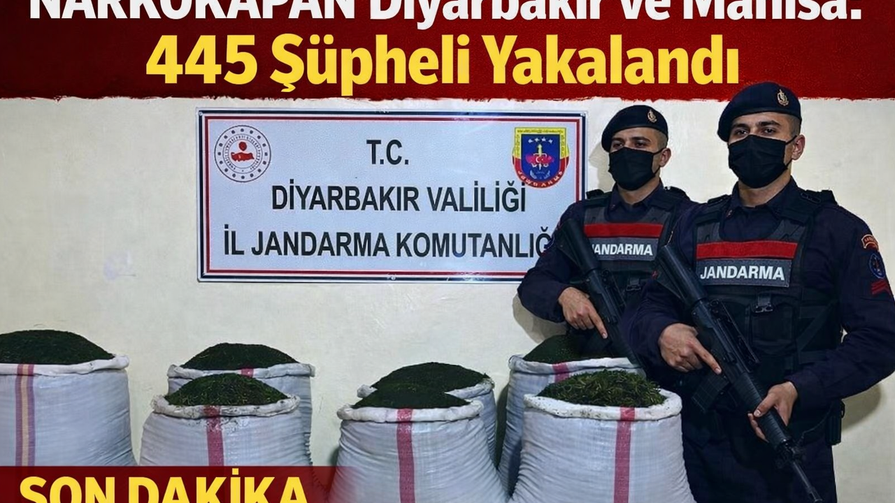 Jandarma ekipleri tarafından Diyarbakır ve Manisa’da zehir tacirlerine yönelik “NARKOKAPAN DİYARBAKIR VE MANİSA” adıyla geniş çaplı operasyonlar düzenlendi. Eş zamanlı gerçekleştirilen operasyonlarda 445 şüpheli yakalandı.