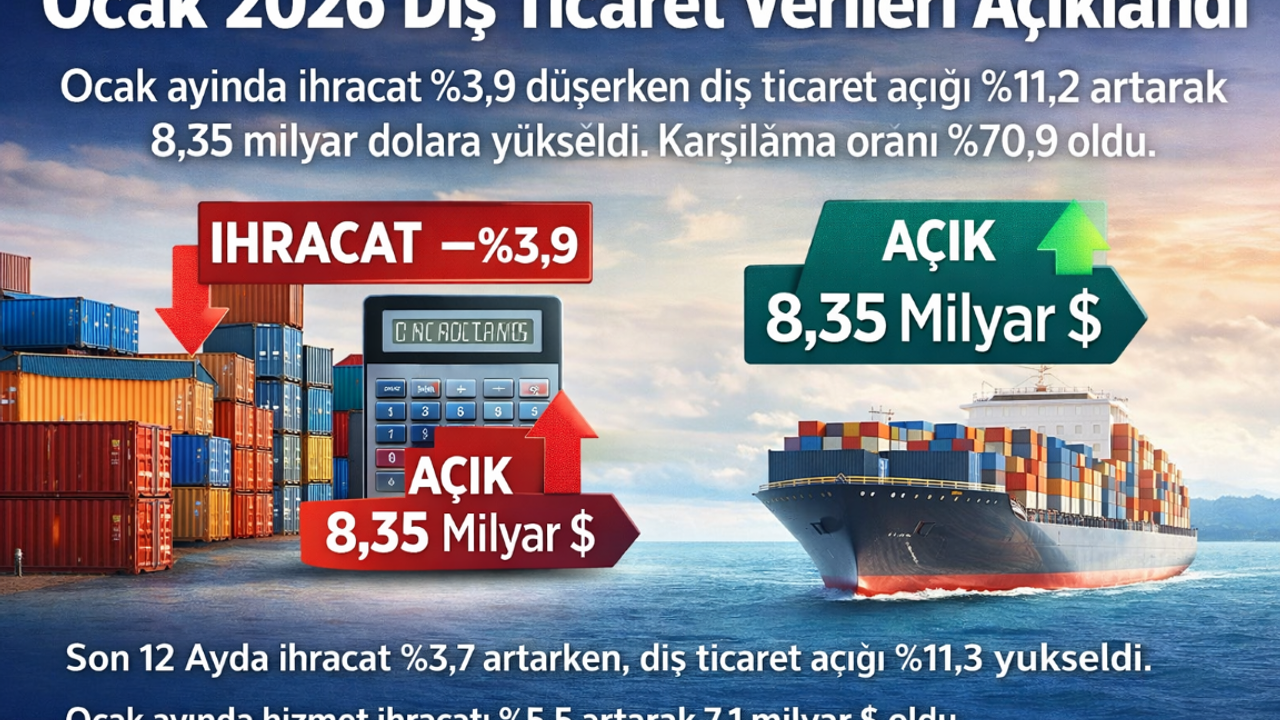 Ocak ayında mal ihracatı, 2025 yılının aynı ayına göre %3,9 azalarak 20 milyar 328 milyon dolar olarak gerçekleşti. Aynı dönemde mal ithalatı 28 milyar 681 milyon dolar seviyesinde gerçekleşerek önceki yılın Ocak ayına yakın seyretti. İthalatın ihracattan yüksek olması nedeniyle dış ticaret açığı, geçen yılın aynı ayına göre %11,2 artışla 8 milyar 352 milyon dolara yükseldi. İhracatın ithalatı karşılama oranı ise %70,9 olarak kaydedildi.