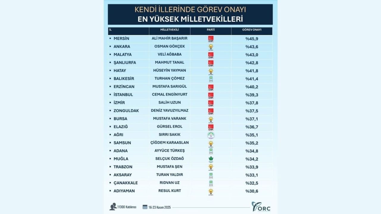 Araştırma, Türkiye genelinde toplam 11.300 katılımcıyla gerçekleştirildi ve 81 ilin tamamından görüş alındı. ORC'nin yüz yüze ve telefon anketi yöntemiyle yaptığı çalışma, seçmenlerin milletvekillerinin performansına yönelik güncel değerlendirmelerini yansıttı.