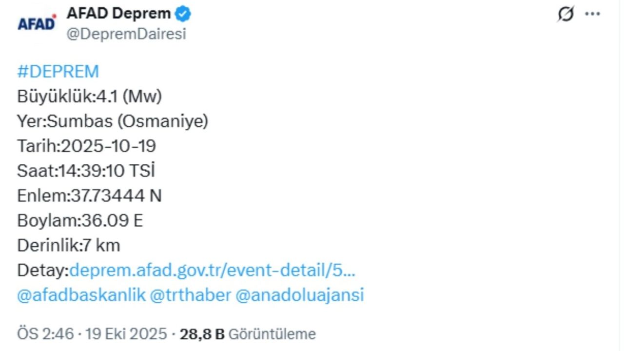 Afet ve Acil Durum Yönetimi Başkanlığı (AFAD) tarafından yapılan açıklamaya göre, saat 18.00 sıralarında meydana gelen depremin merkez üssü Osmaniye'nin Sumbas ilçesi olarak belirlendi. Depremin büyüklüğü 4.1, derinliği ise 7 kilometre olarak açıklandı.