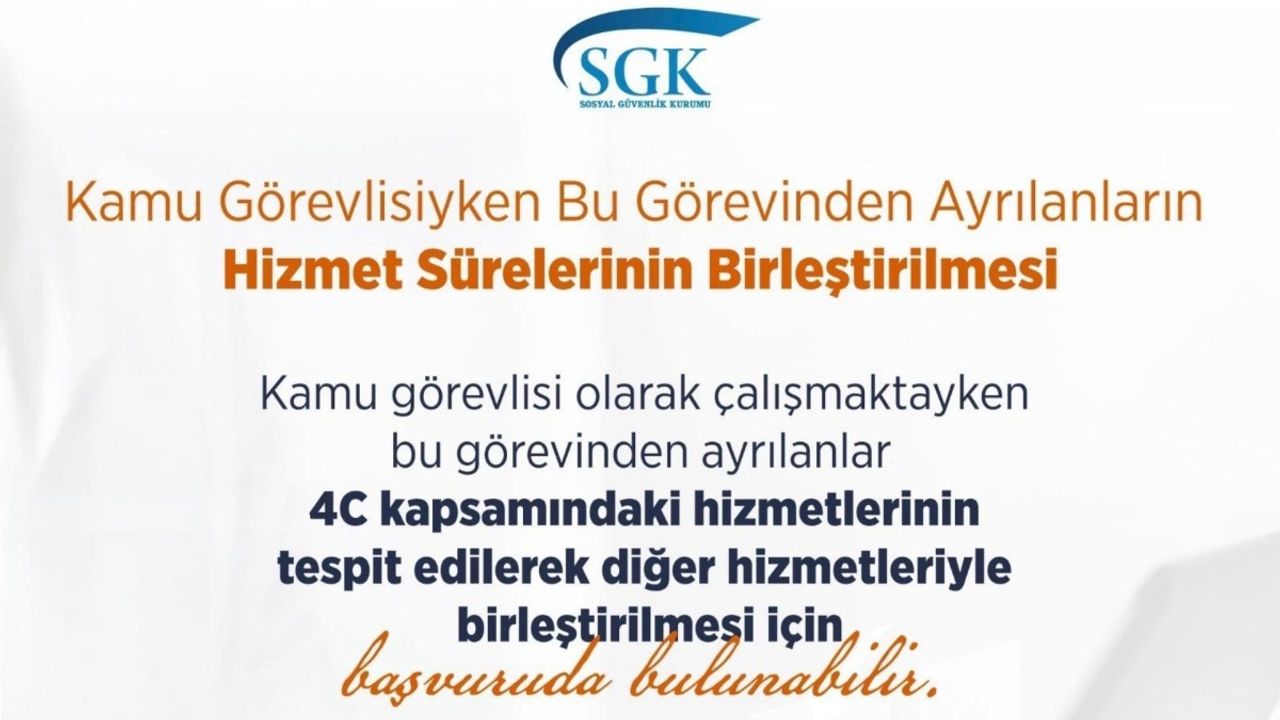 SGK tarafından yapılan açıklamada, kamu görevlisi olarak görev yaparken çeşitli nedenlerle görevinden ayrılan kişilerin, 4/c kapsamındaki hizmet sürelerinin tespit edilerek diğer hizmetleriyle birleştirilmesi amacıyla başvuruda bulunabilecekleri belirtildi. Açıklamada, söz konusu başvuruların e-Devlet Kapısı üzerinden gerçekleştirilebileceği ifade edildi.