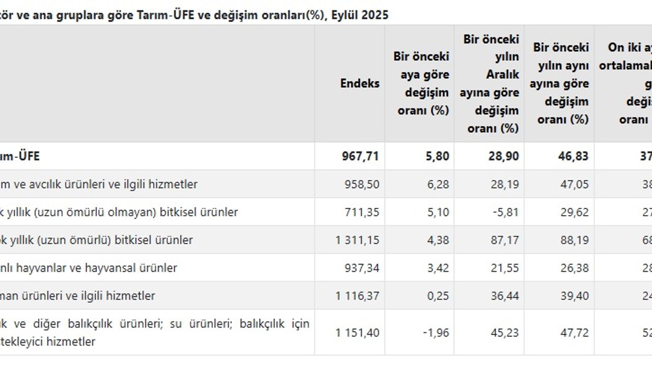 Türkiye İstatistik Kurumu (TÜİK) verilerine göre Tarım-ÜFE'de (2020=100), 2025 yılı Eylül ayında bir önceki aya göre yüzde 5,80 artış, bir önceki yılın Aralık ayına göre yüzde 28,90 artış, bir önceki yılın aynı ayına göre yüzde 46,83 artış ve on iki aylık ortalamalara göre yüzde 37,98 artış gerçekleşti.