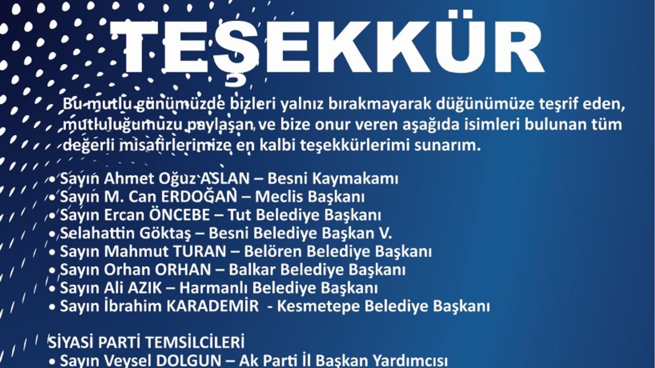 Bu mutlu günümüzde bizleri yalnız bırakmayarak düğünümüze teşrif eden, mutluluğumuzu paylaşan, bize onur veren tüm değerli misafirlerimize teşekkür ederiz.