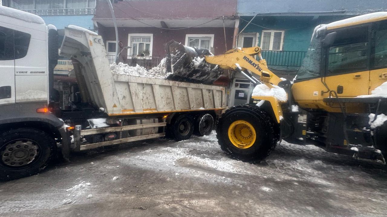 Ekipler, bir yandan yollarda buzlanmaya karşı tuzlama çalışması yaparken, bir yandan da iş makineleriyle cadde ve sokaklardaki karları kamyonlara yükleyip ilçe dışına taşıyor.