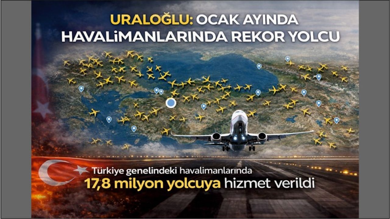 Abdulkadir Uraloğlu, ocak ayında Türkiye genelindeki havalimanlarında direkt transit yolcular dâhil olmak üzere toplam 17,8 milyon yolcuya hizmet verildiğini açıkladı.